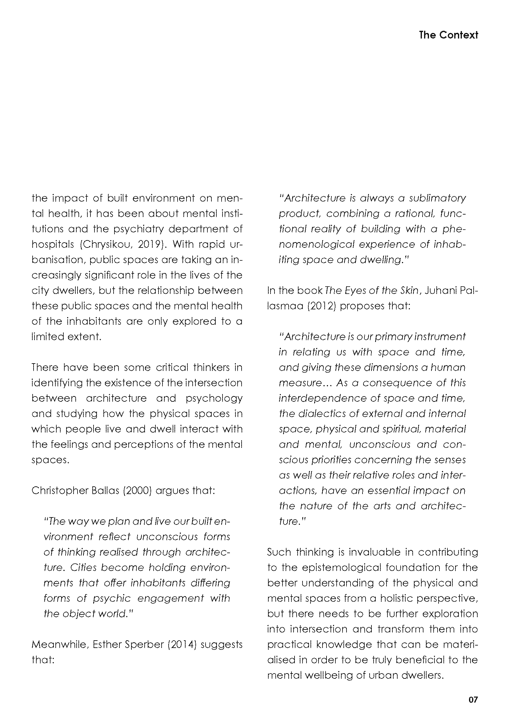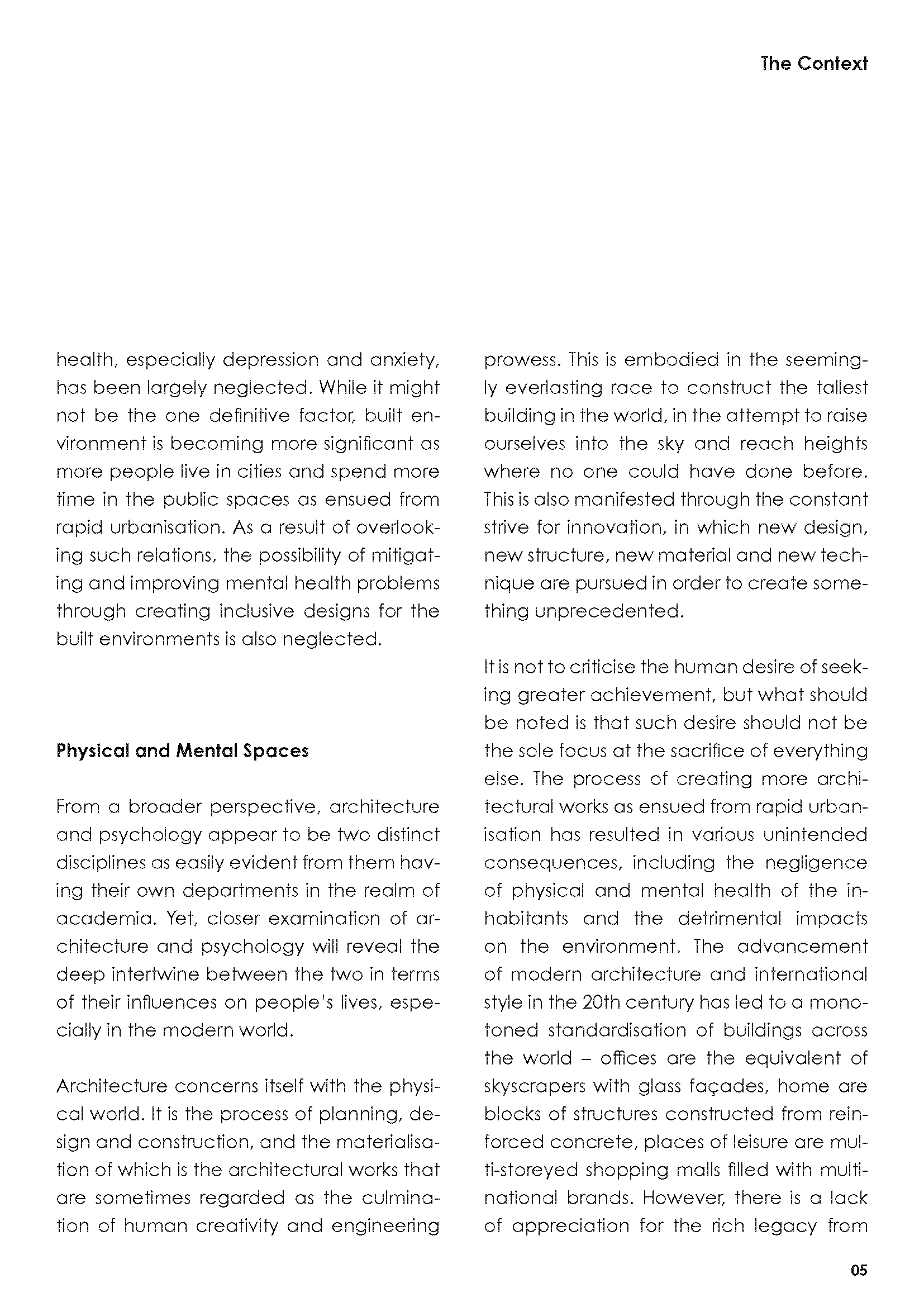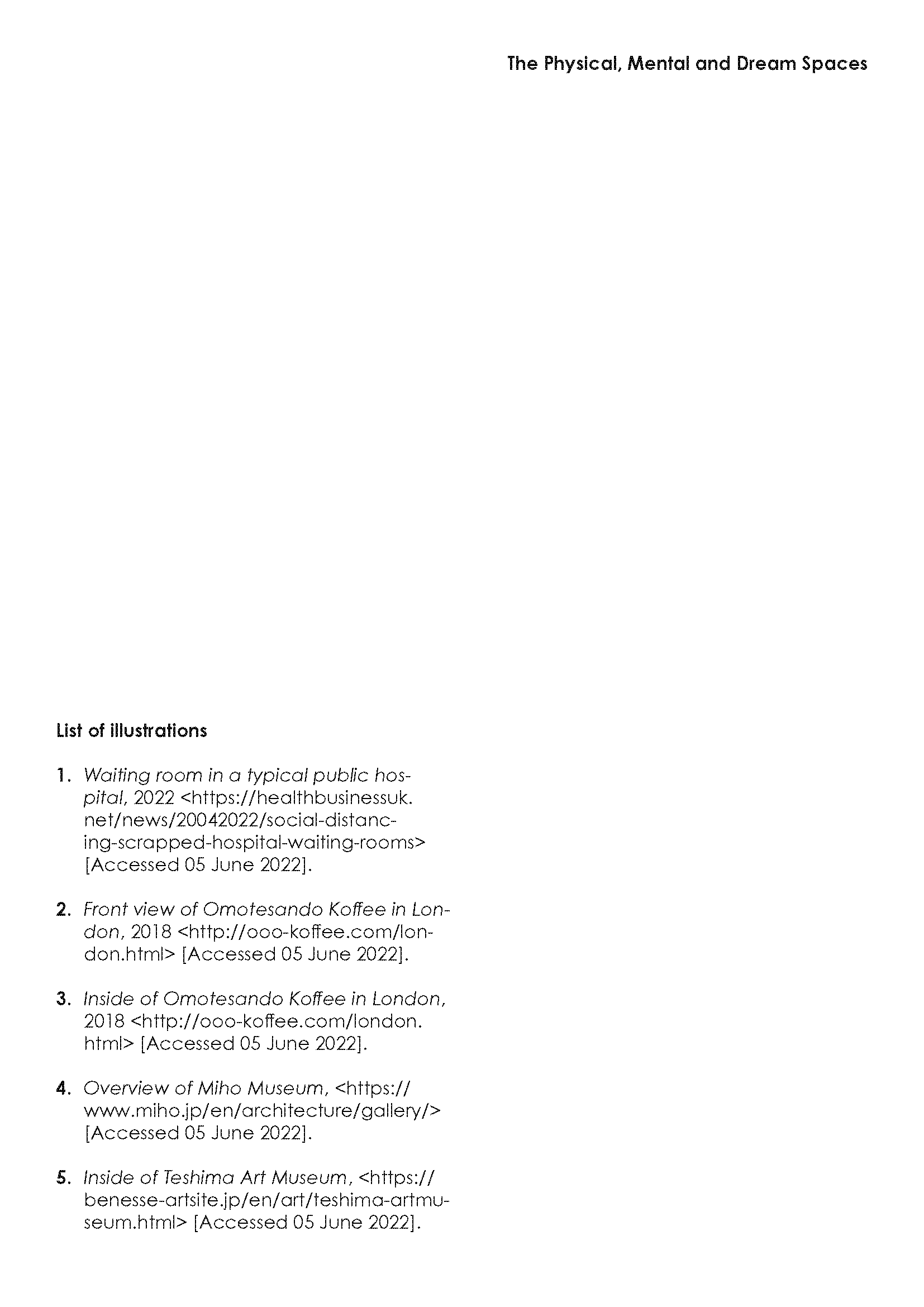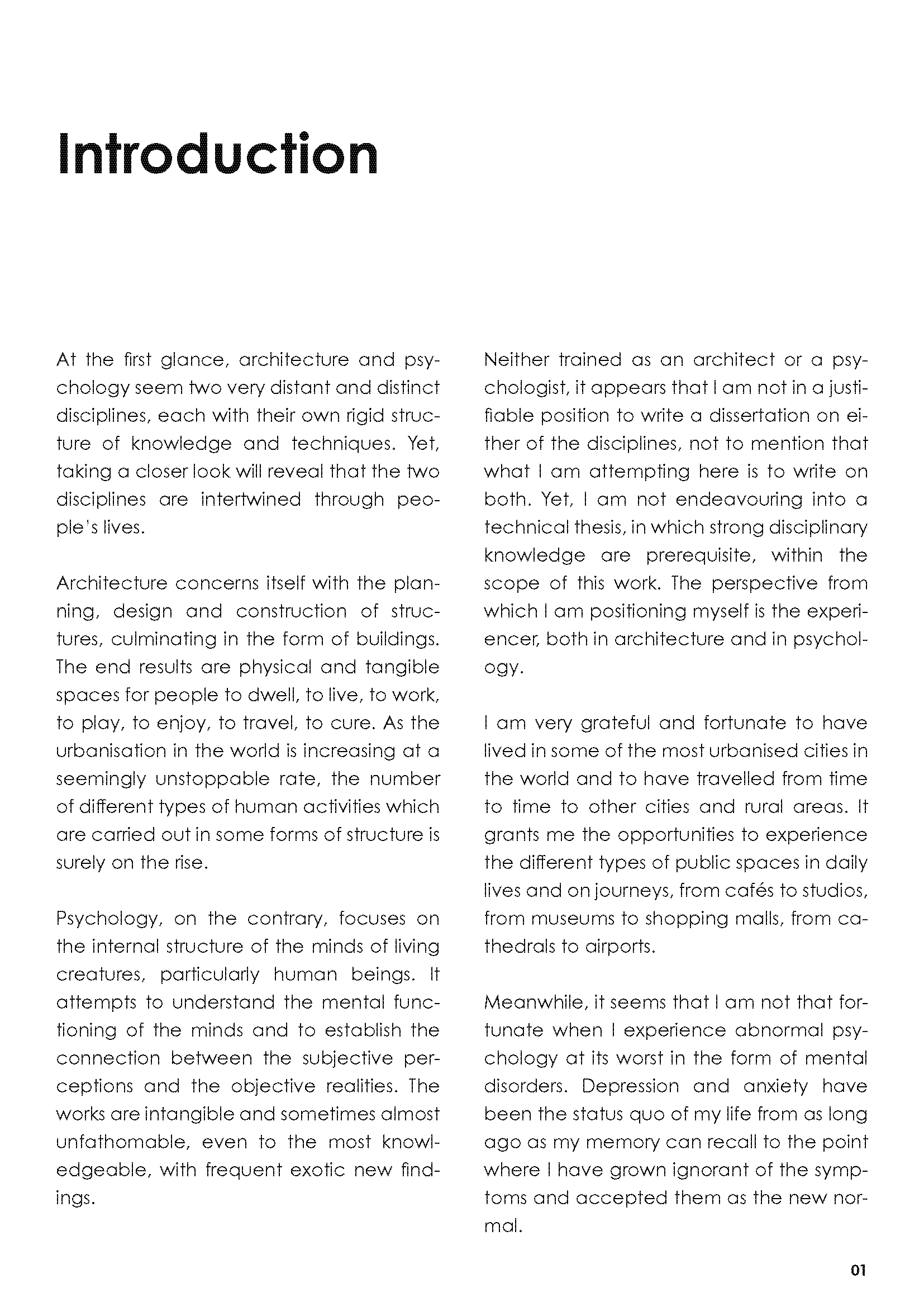 In the dissertation, I investigated the relationship between physical, mental and dream spaces, and attempted to utilise such interactions in order to inform better designs for mental wellbeing.